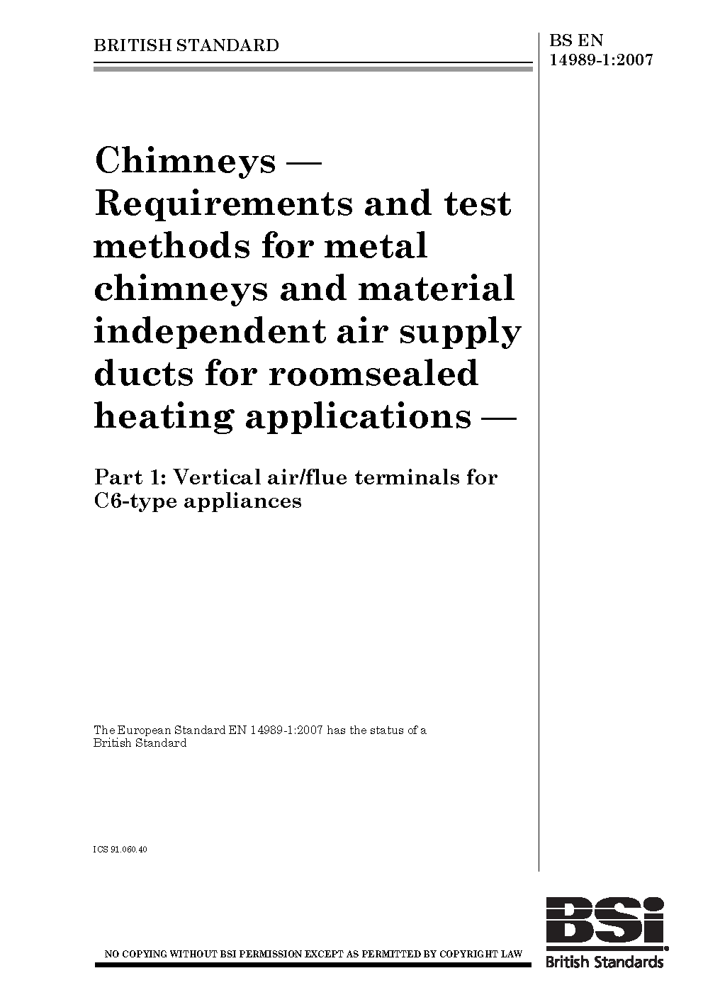 Chimneys. Requirements and test methods for metal chimneys material independent air supply ducts roomsealed heating applications Vertical air/flue terminals C6-type appliances