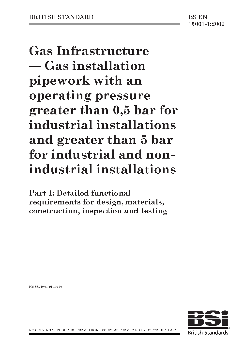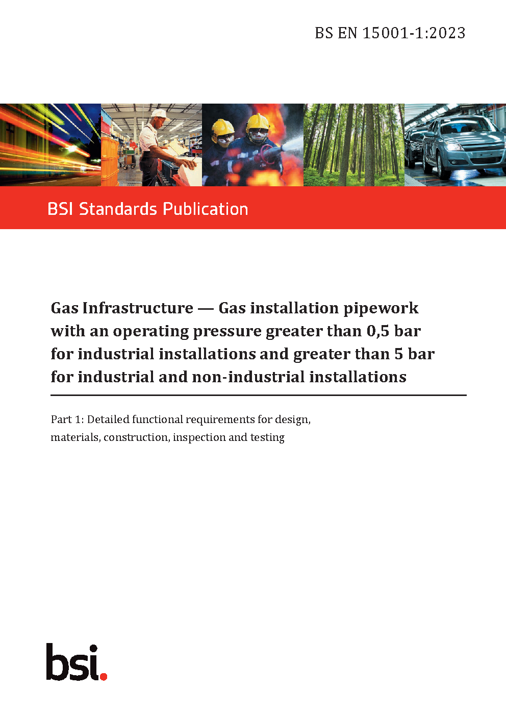 Gas infrastructure. installation pipework with an operating pressure greater than 0,5 bar for industrial installations and 5 non-industrial Detailed functional requirements design, materials, construction, inspection testing