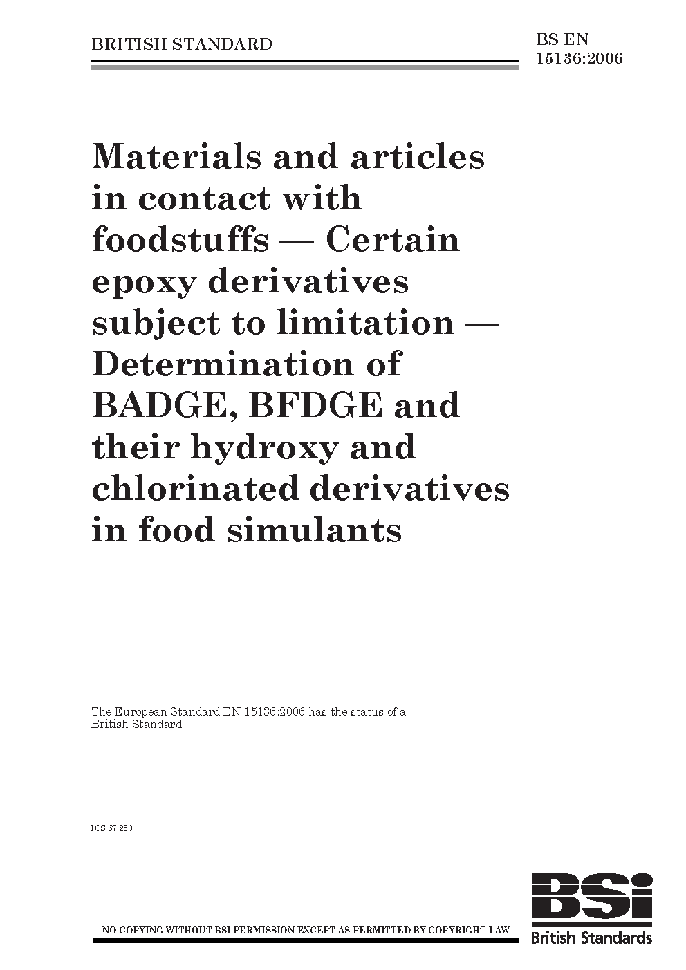 Materials in contact with food;Liquid chromatography;Epoxy resins;Packaging materials;Food testing;Cans;Coatings;Plastics;Chemical analysis and testing;Determination of content;Migration (chemical)
