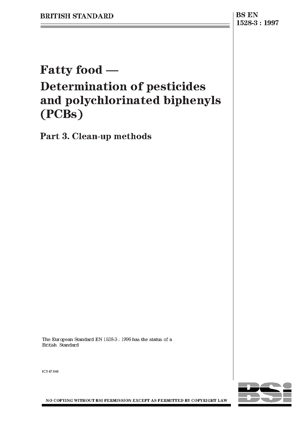 Fatty food. Determination of pesticides and polychlorinated biphenyls (PCBs) Clean-up methods
