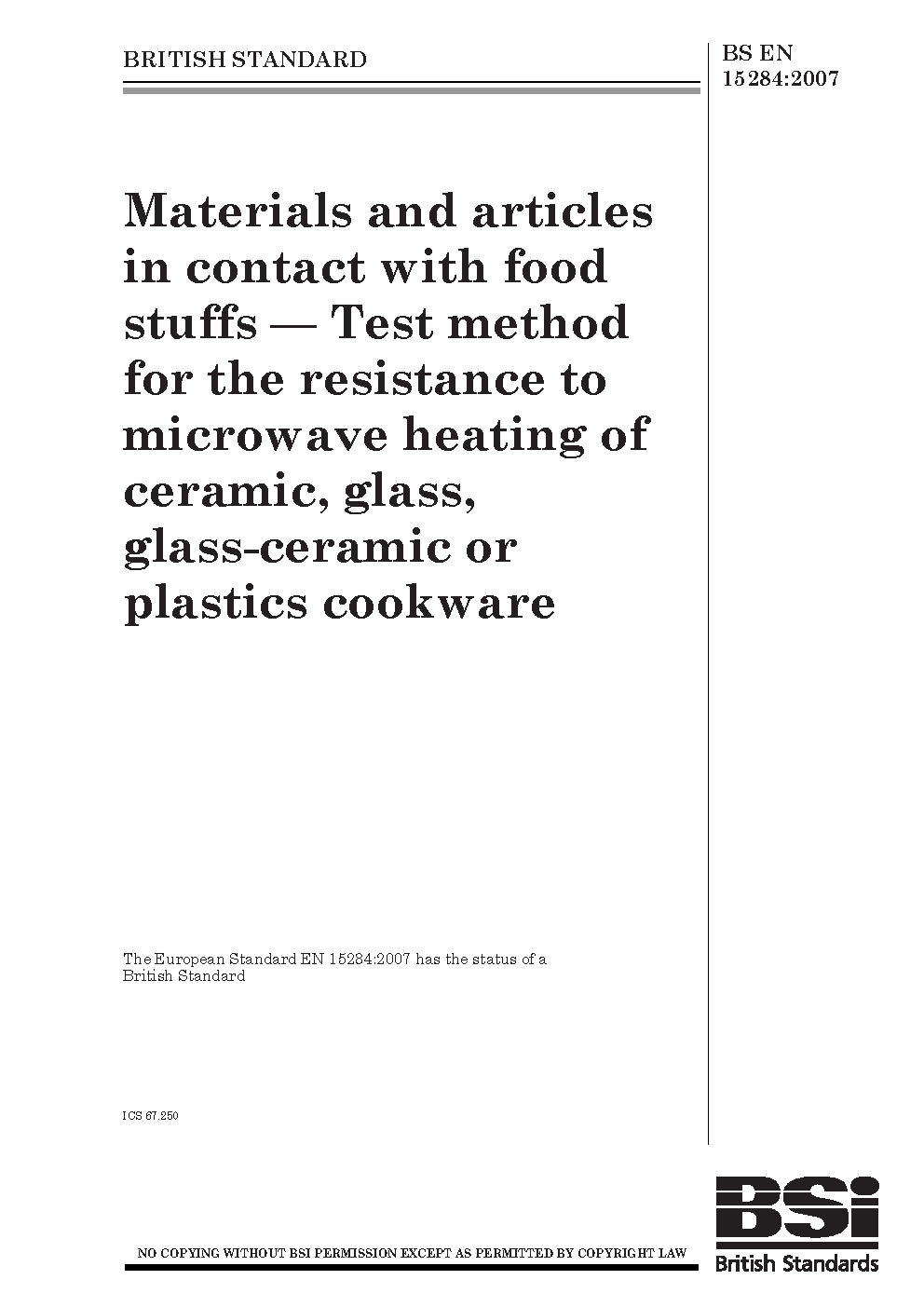 Materials and articles in contact with food stuffs. Test method for the resistance to microwave heating of ceramic, glass, glass-ceramic or plastic cookware