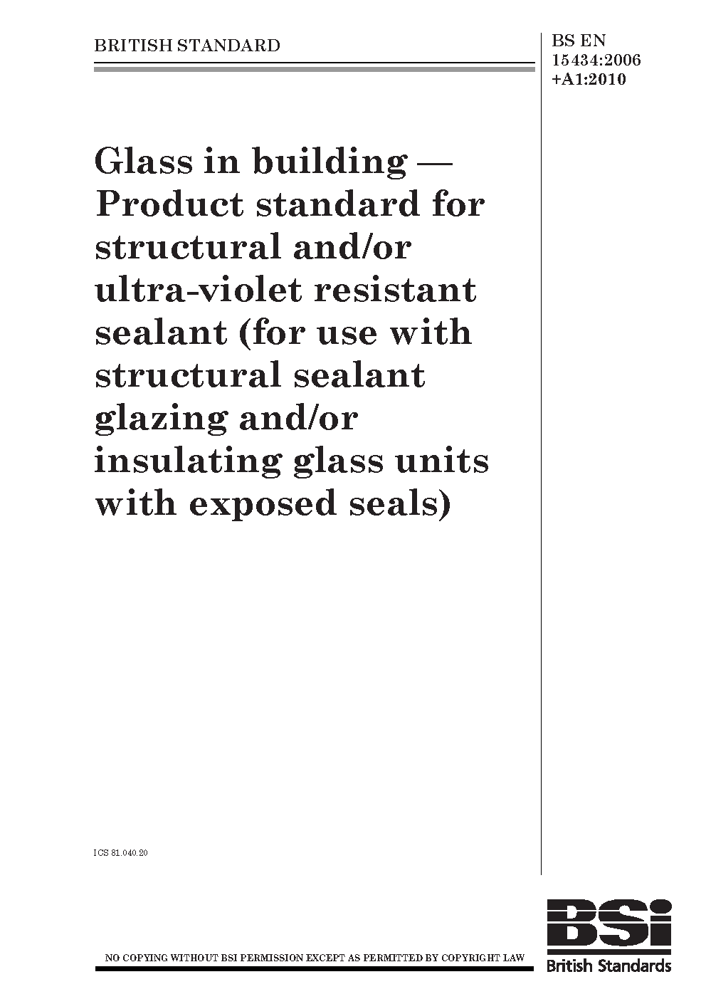 Glass in building. Product standard for structural and/or ultra-violet resistant sealant (for use with structural sealant glazing and/or insulating glass units with exposed seals)