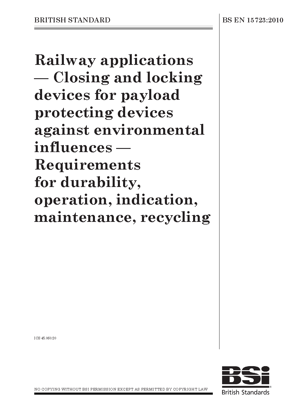 Railway applications. Closing and locking devices for payload protecting devices against environmental influences. Requirements for durability, operation, indication, maintenance, recycling