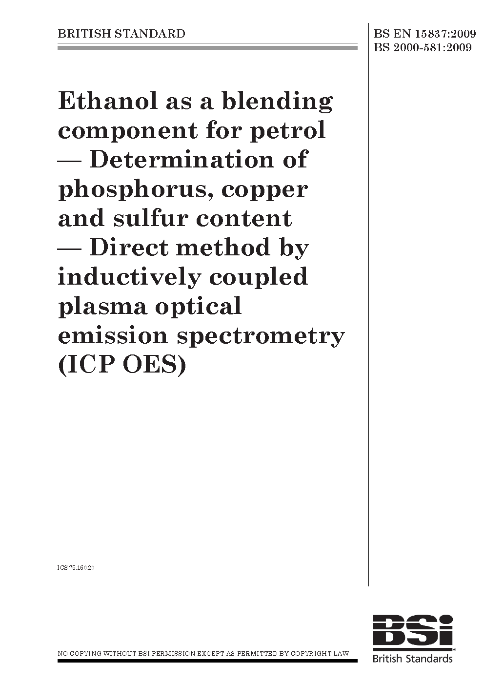 Ethanol as a blending component for petrol. Determination of phosphorus, copper and sulfur content. Direct method by inductively coupled plasma optical emission spectrometry (ICP OES)