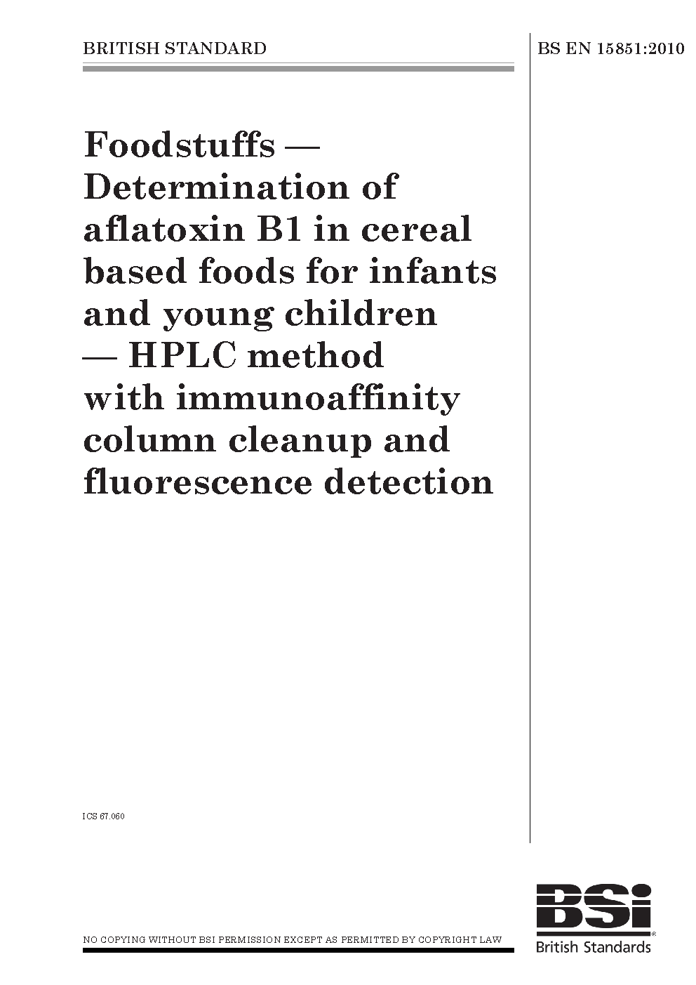 Foodstuffs. Determination of aflatoxin B1 in cereal based foods for infants and young children. HPLC method with immunoaffinity column cleanup and fluorescence detection