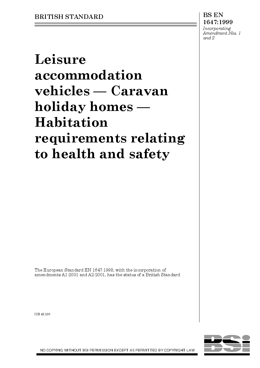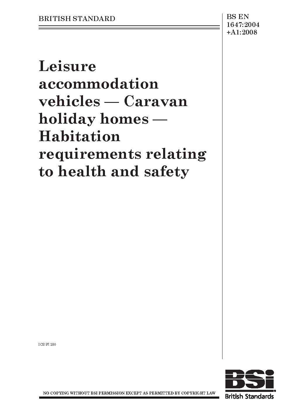 Leisure accommodation vehicles. Caravan holiday homes. Habitation requirements relating to health and safety