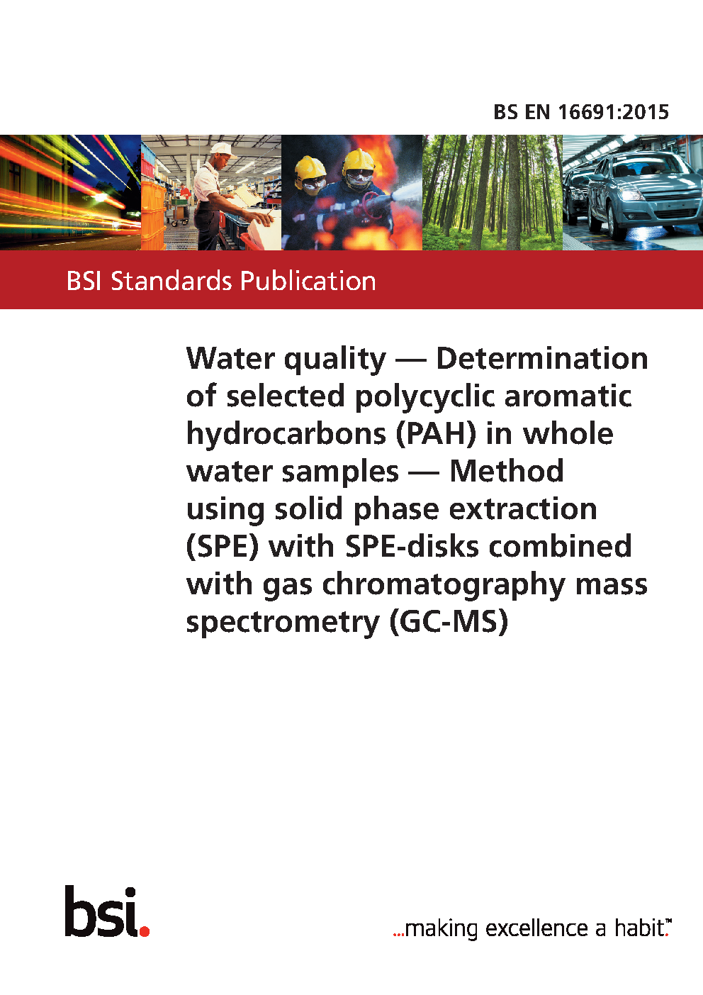 Water quality. Determination of selected polycyclic aromatic hydrocarbons (PAH) in whole water samples. Method using solid phase extraction (SPE) with SPE-disks combined with gas chromatography mass spectrometry (GC-MS)