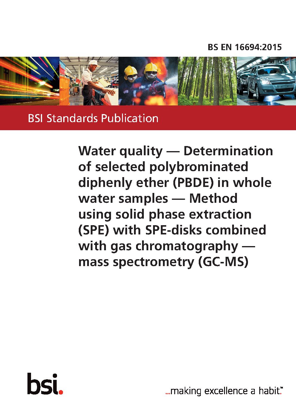Water quality. Determination of selected polybrominated diphenly ether (PBDE) in whole water samples. Method using solid phase extraction (SPE) with SPE-disks combined with gas chromatography-mass spectrometry (GC-MS)