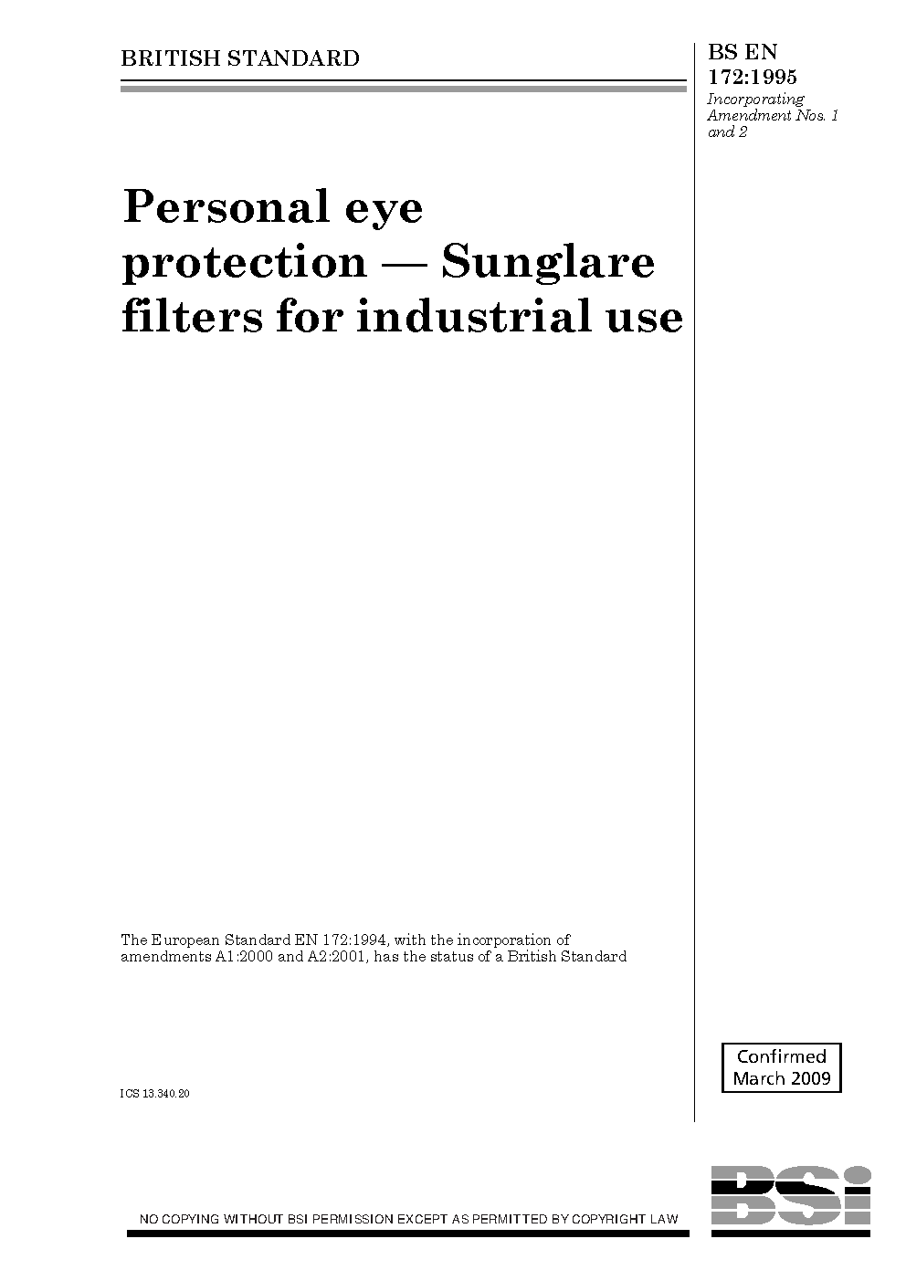 Specification for sunglare filters used in personal eye-protectors for industrial use