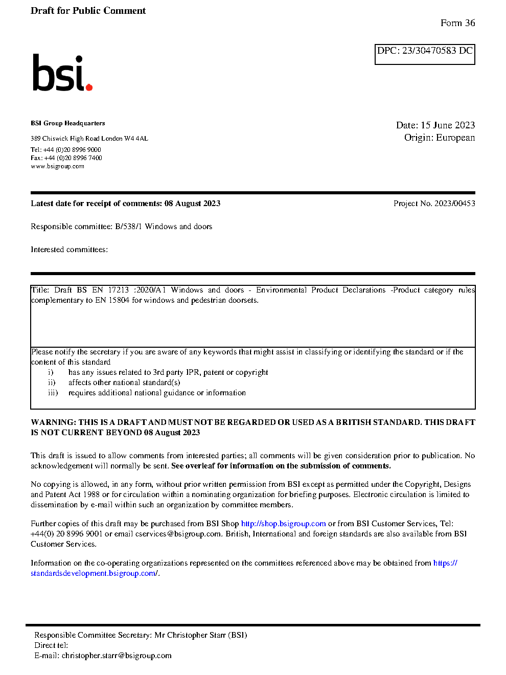 Windows and doors. Environmental Product Declarations. Product category rules complementary to EN 15804 for windows and pedestrian doorsets