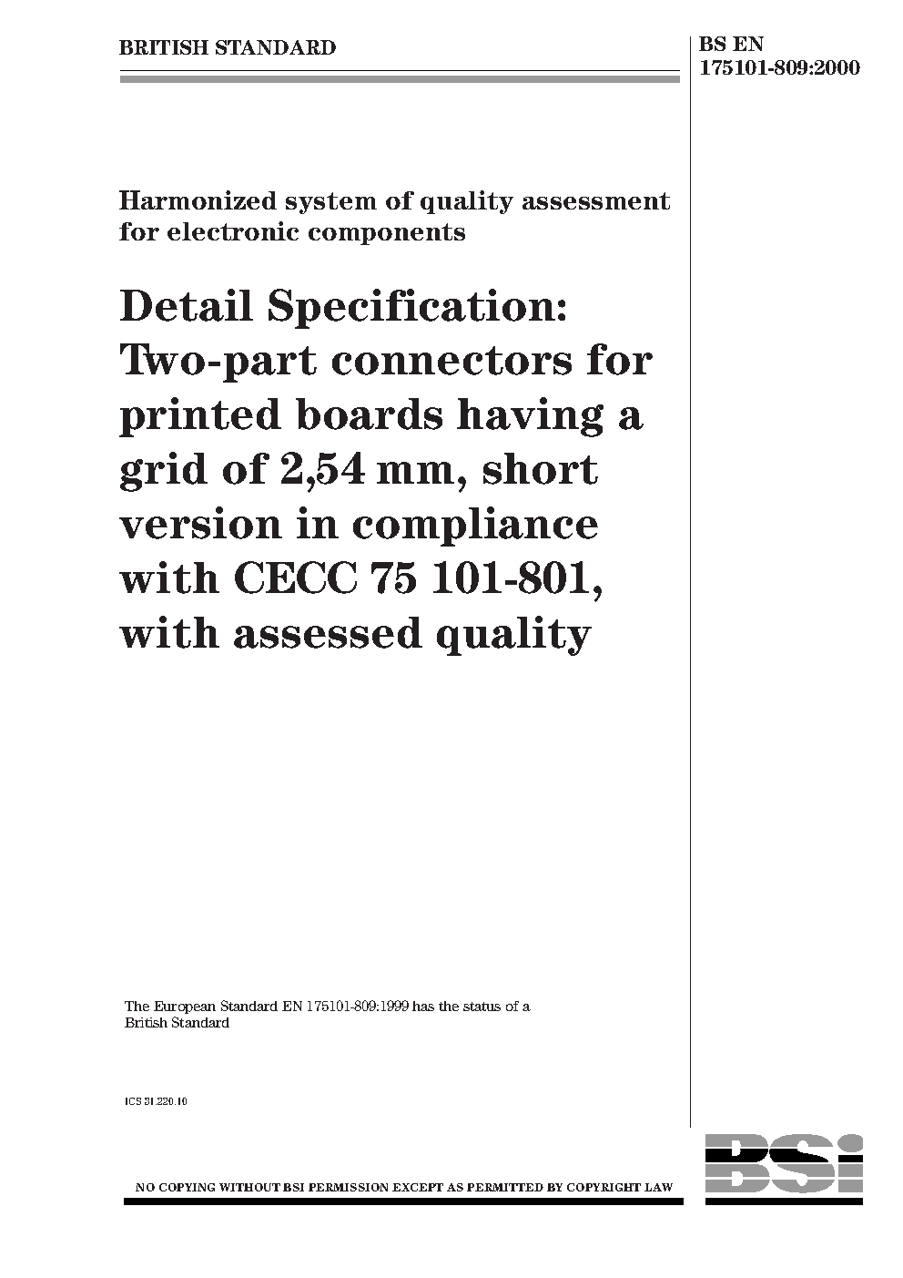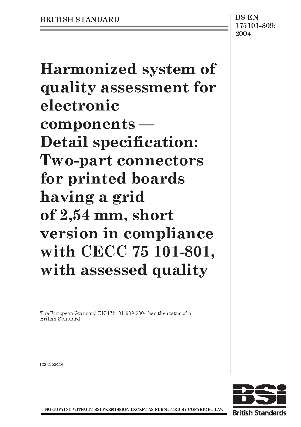 Harmonized system of quality assessment for electronic components. Detail specification Two-part connectors printed boards having a grid 2,54 mm, short version in compliance with CECC 75 101-801, assessed