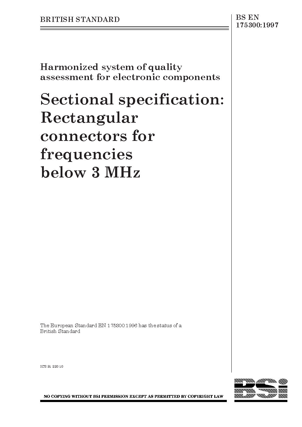 Harmonized system of quality assessment for electronic components. Sectional specification: rectangular connectors for frequencies below 3 MHz