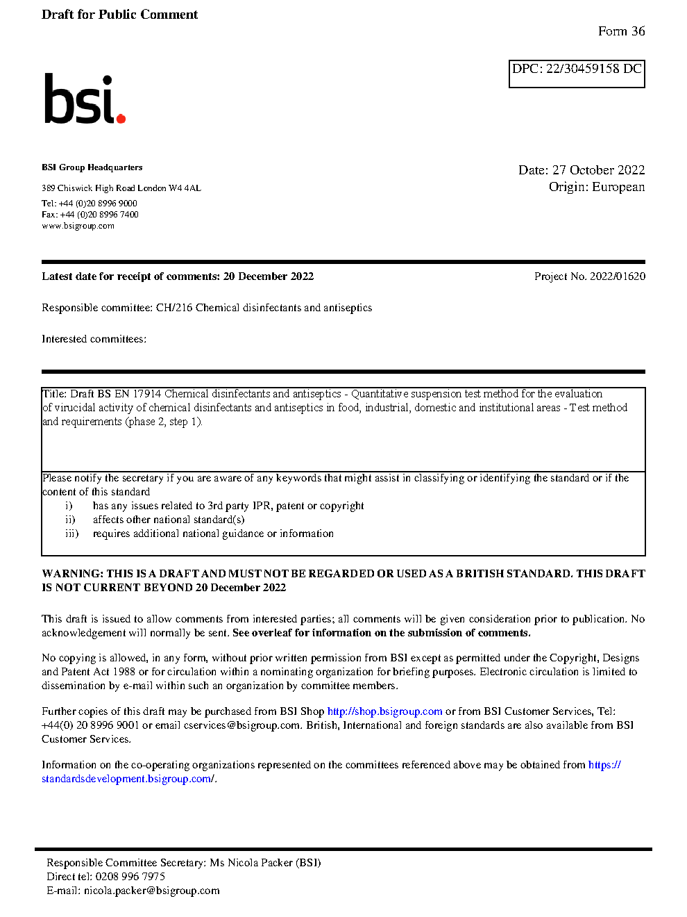 Chemical disinfectants and antiseptics. Quantitative suspension test for the evaluation of virucidal activity in the food, industrial, domestic and institutional area. Test method and requirements (Phase 2/Step 1)