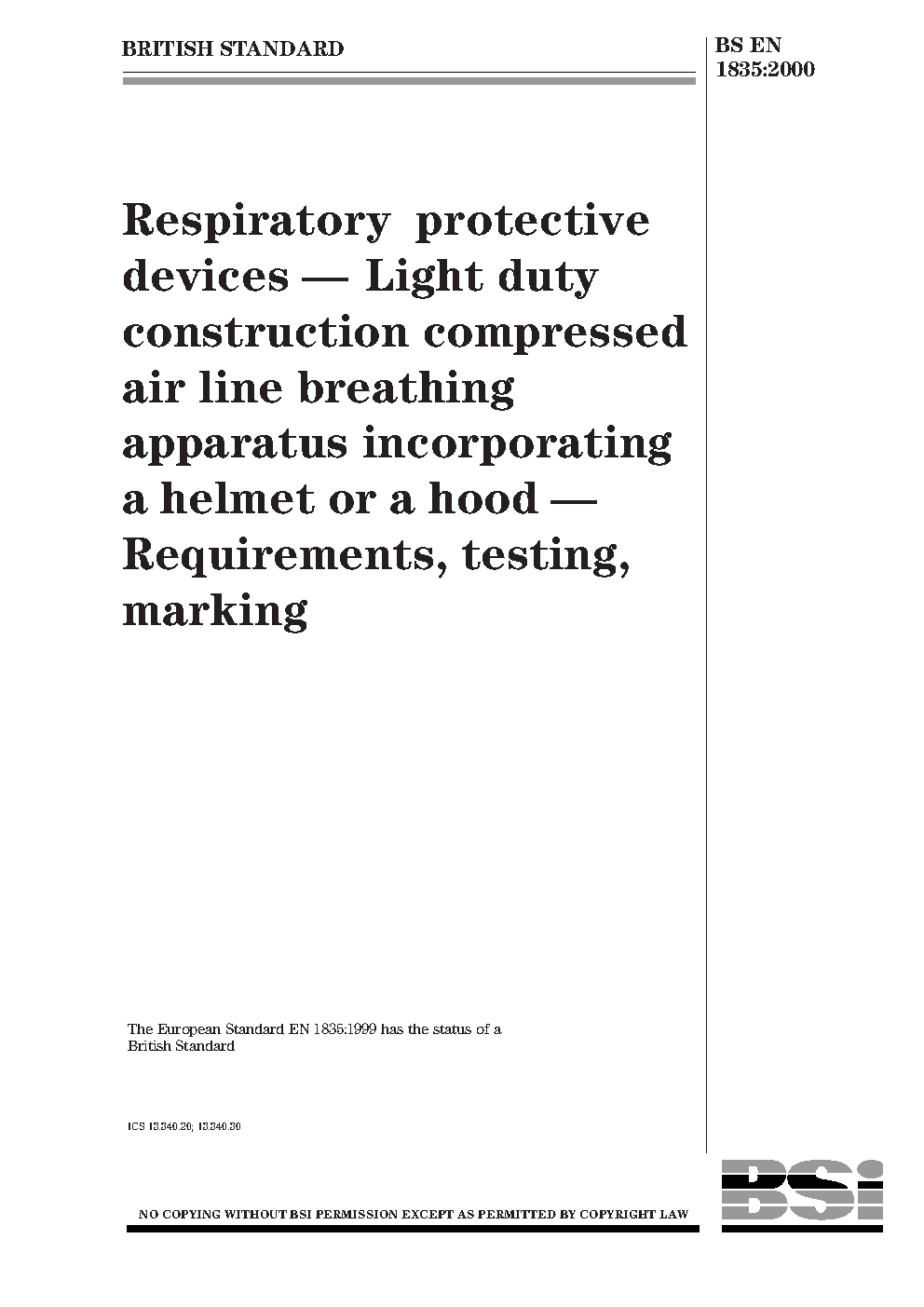 Respiratory protective devices. Light duty construction compressed air line breathing apparatus incorporating a helmet or a hood. Requirements, testing, marking