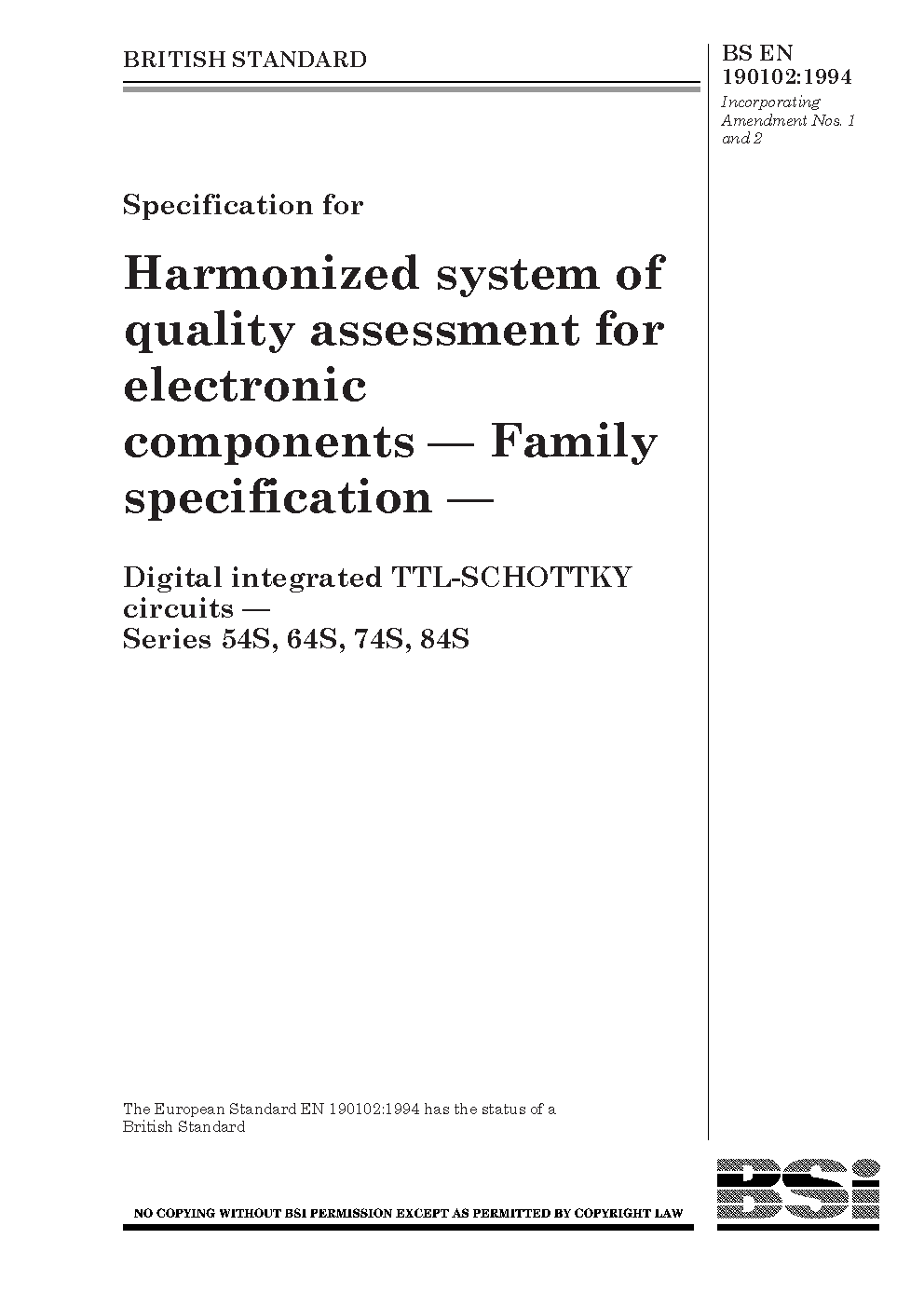 Specification for harmonized system of quality assessment for electronic components. Family specification: digital integrated TTL-SCHOTTKY circuits, series 54S, 64S, 74S, 84S