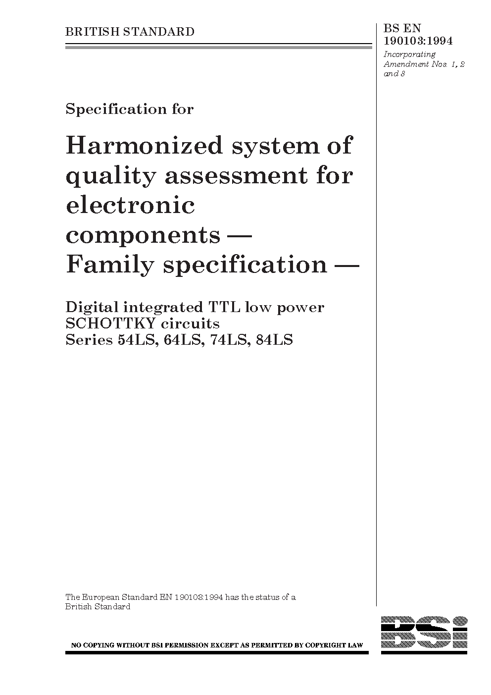 Specification for harmonized system of quality assessment for electronic components. Family specification: digital integrated TTL low power SCHOTTKY, circuits, series 54LS, 64LS, 74LS, 84LS