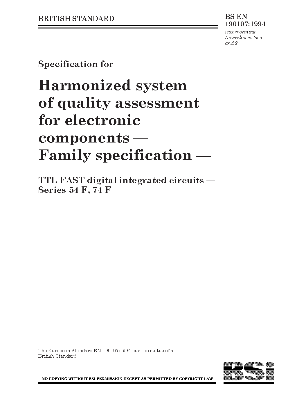 Specification for harmonized system of quality assessment for electronic components. Family specification. TTL FAST digital integrated circuits series 54 F, 74 F