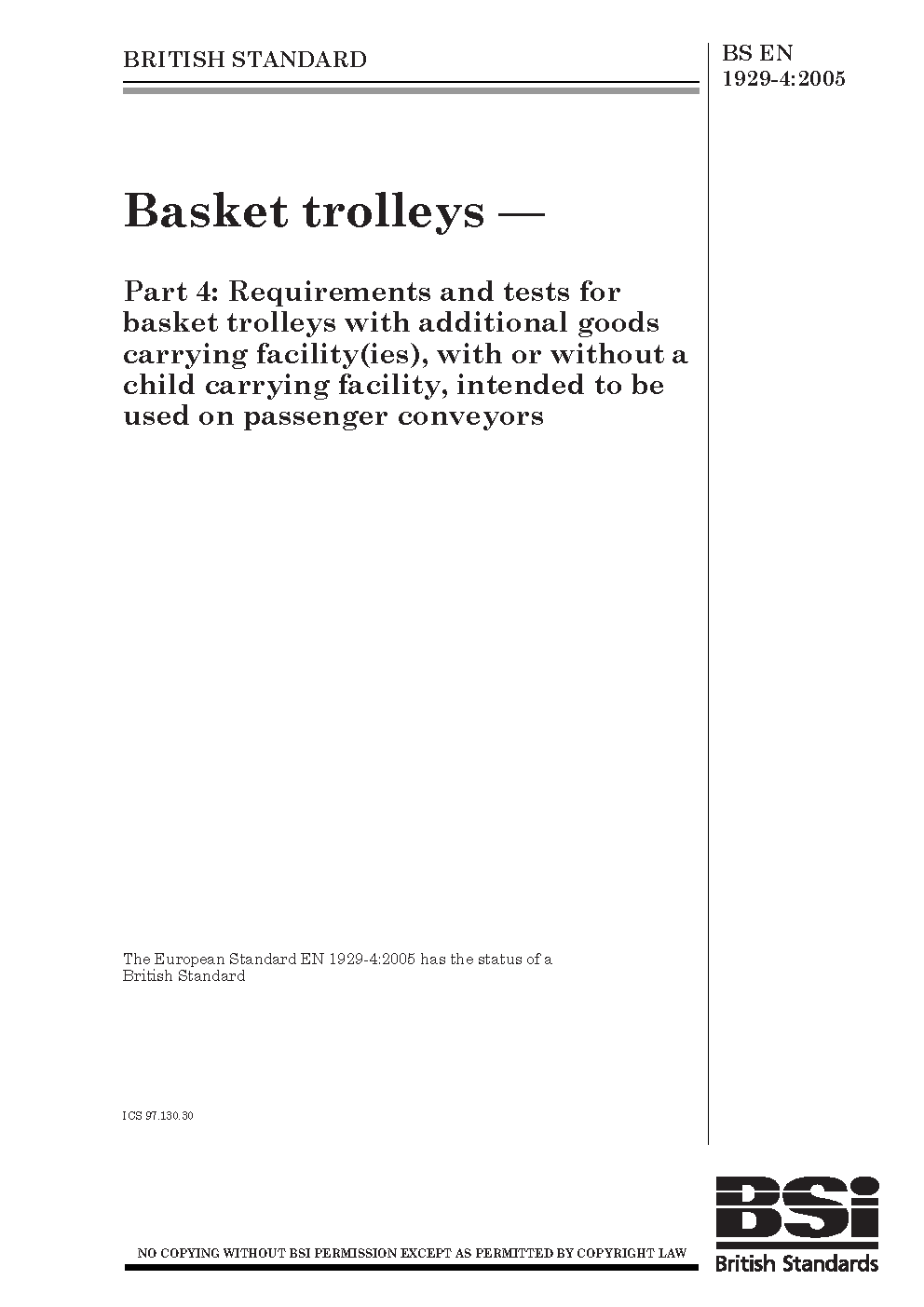 Basket trolleys Requirements and tests for basket with additional goods carrying facility(ies), or without a child facility, intended to be used on passenger conveyors