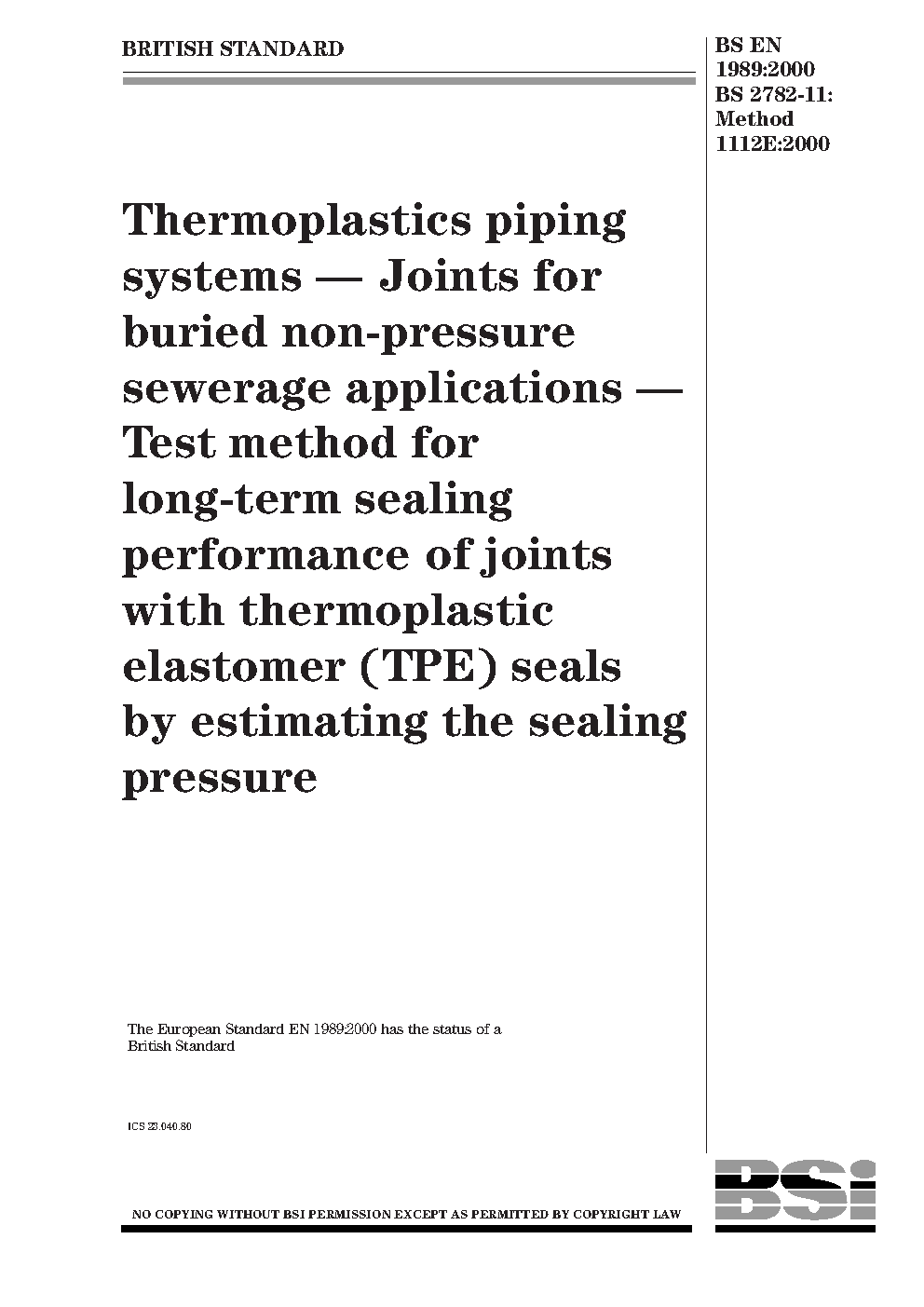 Thermoplastics piping systems. Joints for buried non-pressure sewerage applications. Test method for long-term sealing performance of joints with thermoplastic elastomer (TPE) seals by estimating the sealing pressure