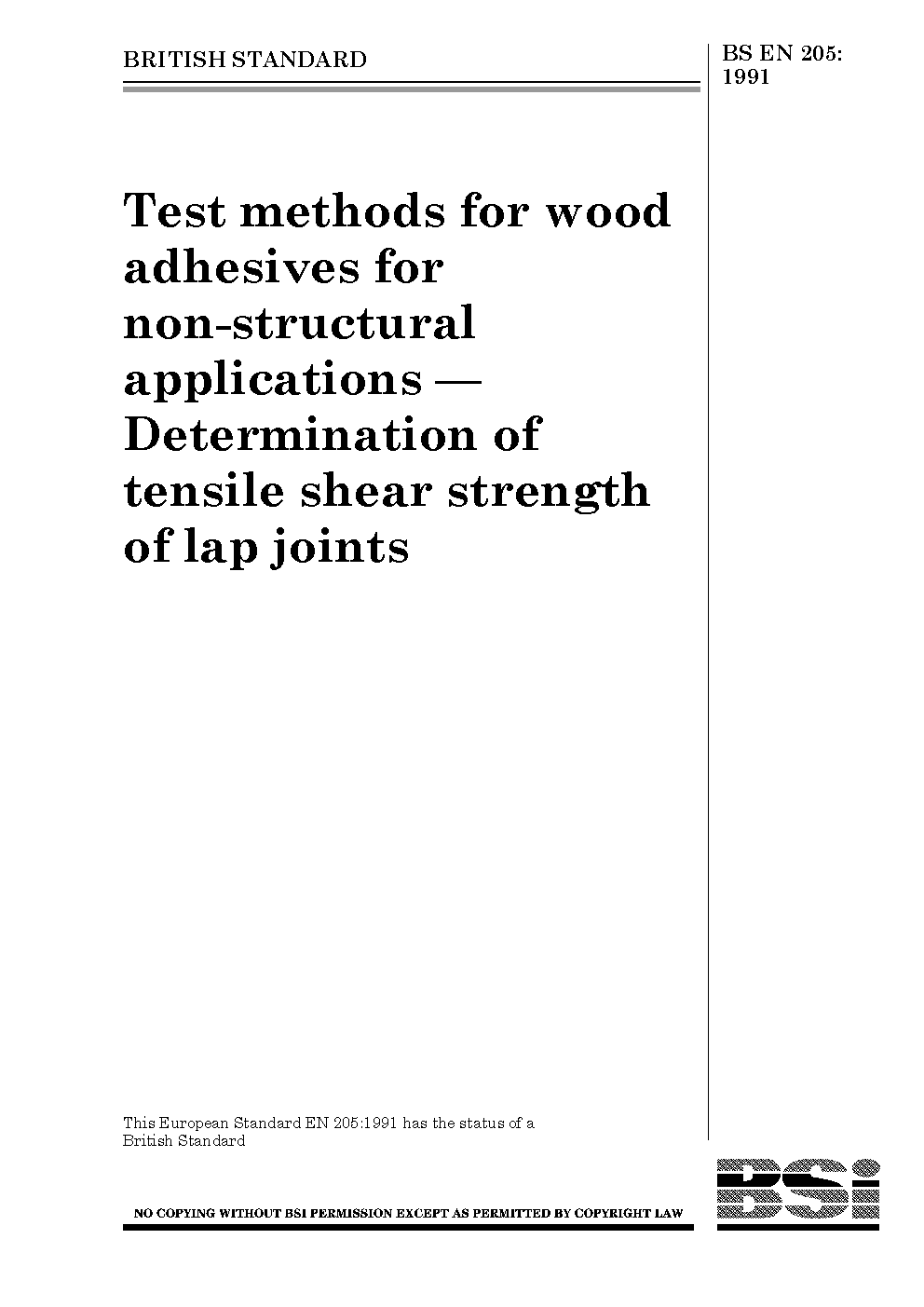 Adhesives. Wood adhesives for non-structural applications. Determination of tensile shear strength of lap joints