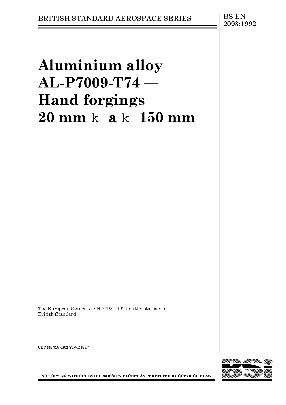 Heat treatment;Proof stress;Forgings;Elongation;Air transport engineering;Space technology;Stress corrosion;Dimensions;Hardness;Electrical conductivity;Aluminium alloys;Tensile strength;Chemical composition