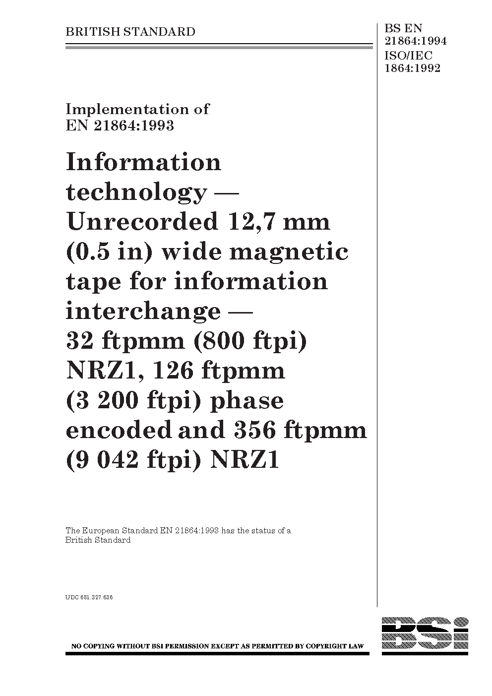 Information technology. Unrecorded 12,7 mm (0,5 in) wide magnetic tape for information interchange. 32 ftpmm (800 ftpi) NRZ1, 126 ftpmm (3 200 ftpi) phase encoded and 356 ftpmm (9 042 ftpi) NRZ1
