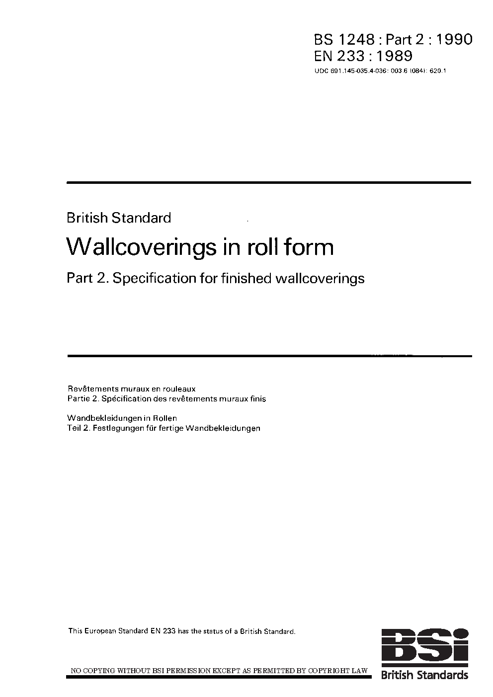 Wallcoverings in roll form. Specification for finished wallpapers, wall vinyls and plastics wallcoverings