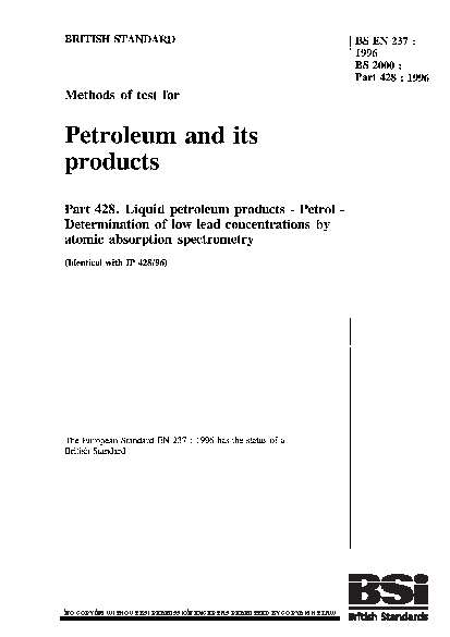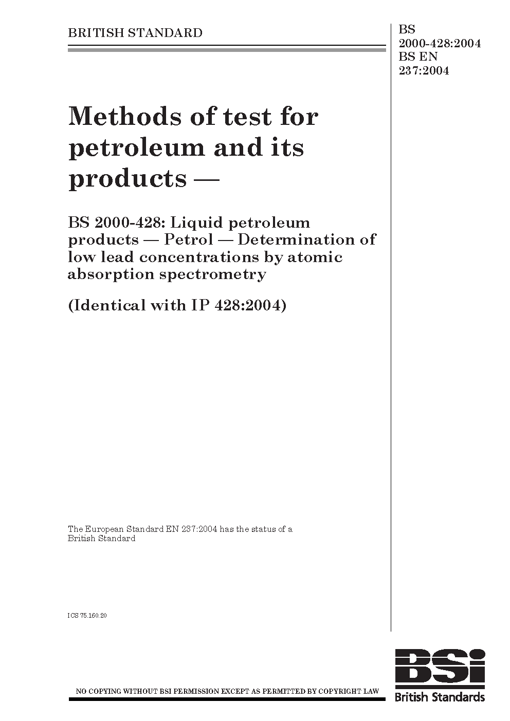 Methods of test for petroleum and its products BS 2000-428: Liquid products. Petrol. Determination low lead concentrations by atomic absorption spectrometry