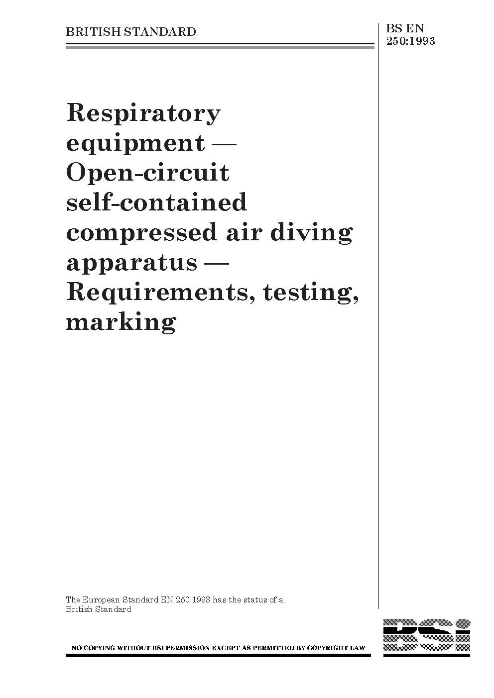Respiratory equipment. Open-circuit self-contained compressed air diving apparatus. Requirements, testing, marking