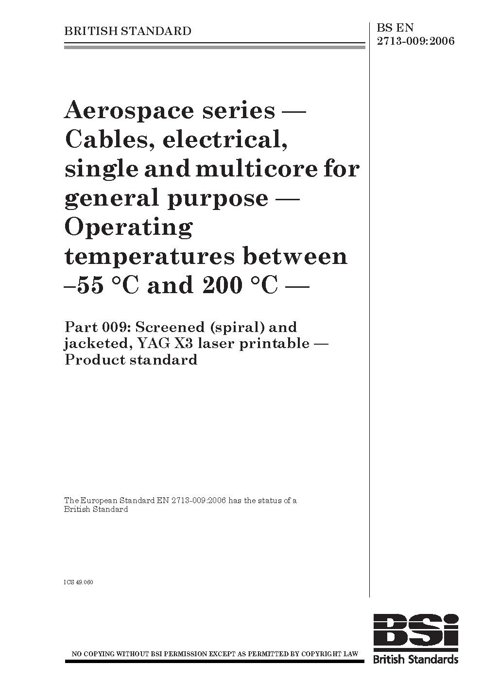 Aerospace series. Cables, electrical, single and multicore for general purpose. Operating temperatures between -55°C 200°C Screened (spiral) jacketed, YAG X3 laser printable. Product standard
