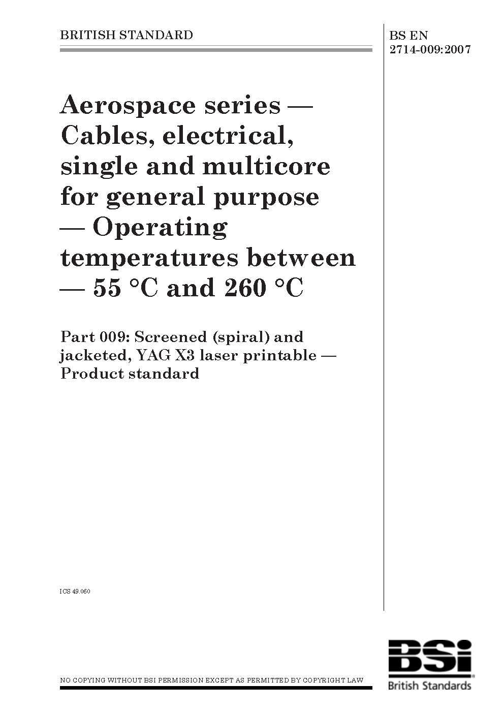 Aerospace series. Cables, electrical, single and multicore for general purpose. Operating temperatures between -55 °C 260 Screened (spiral) jacketed, YAG X3 laser printable. Product standard