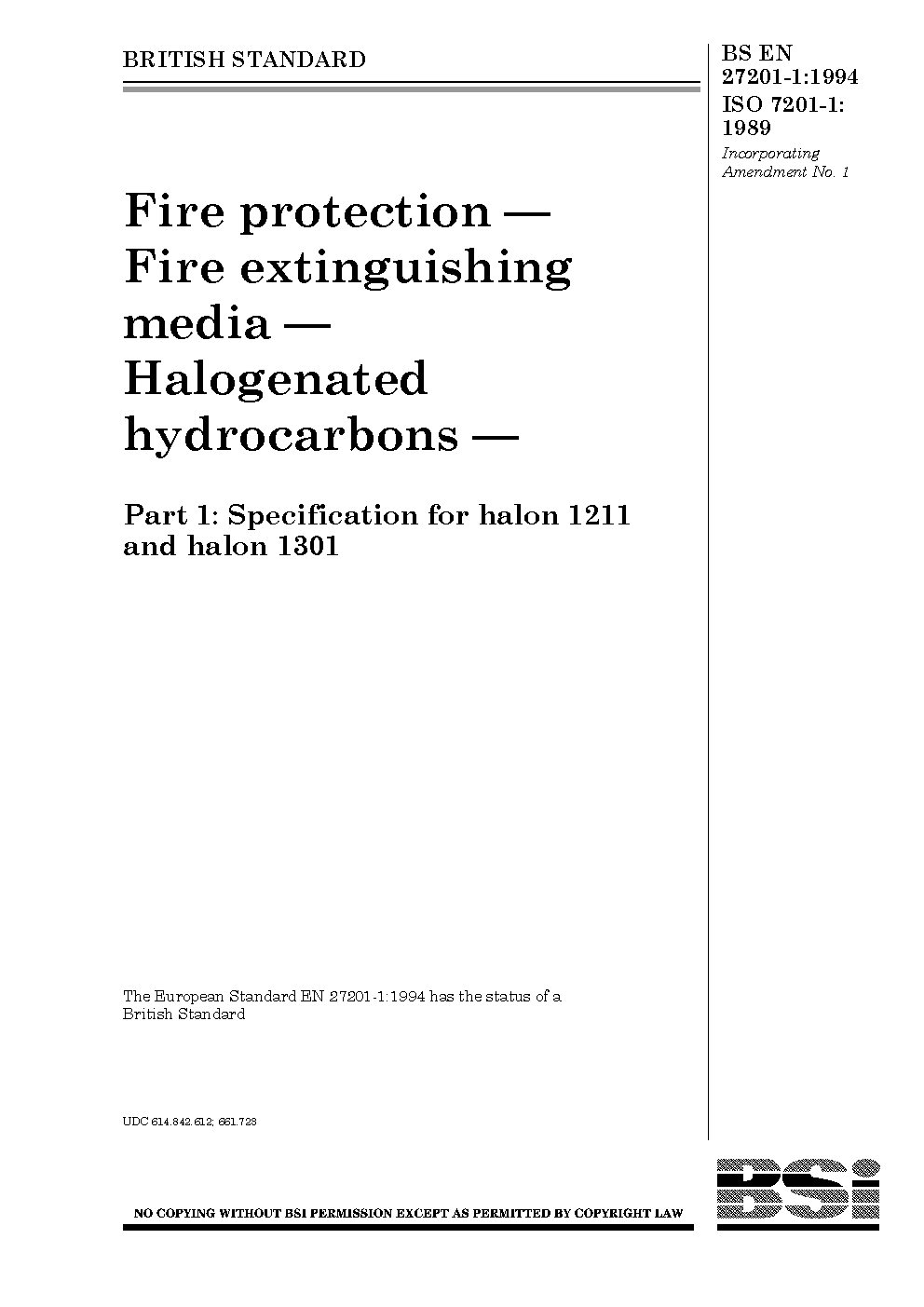 Fire protection. extinguishing media. Halogenated hydrocarbons Specifications for halon 1211 and 1301