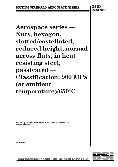 Aerospace series. Nuts, hexagon, slotted/castellated, reduced height, normal across flats, in heat resisting steel, passivated. Classification: 900 MPa (at ambient temperature)/650°C
