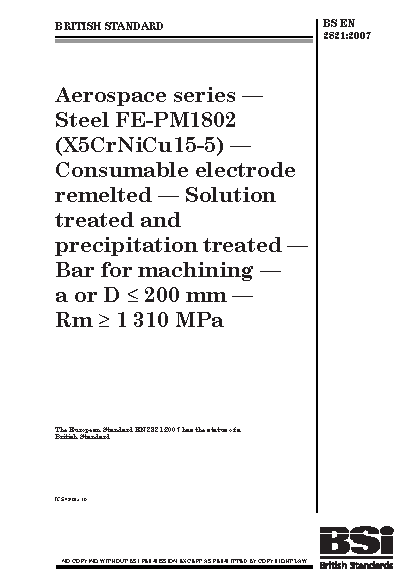 Consumable electrodes;Bars (materials);Remelting;Alloy steels;Chemical composition;Heat treatment;Precipitation hardening;Crystal structure;Steels;Solution heat treatment;Dimensions;Air transport engineering;Defects;Grain size;Tensile strength;Proof stress;Hardness;Elongation
