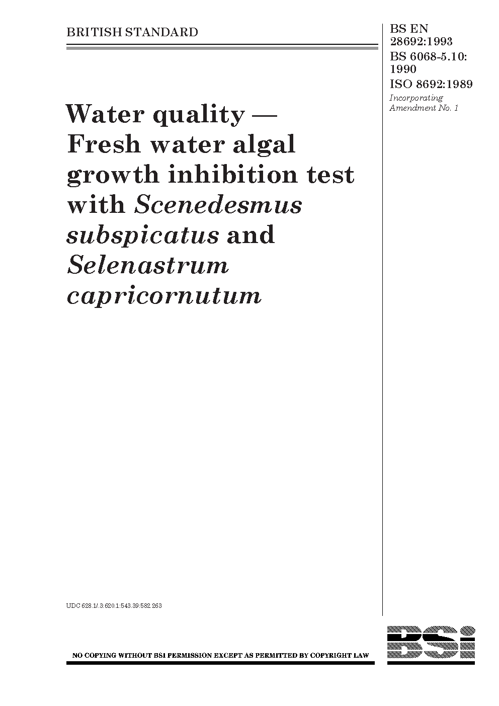 Water quality. Biological methods. Fresh water algal growth inhibition test with Scenedesmus subspicatus and Selenastrum capricornutum