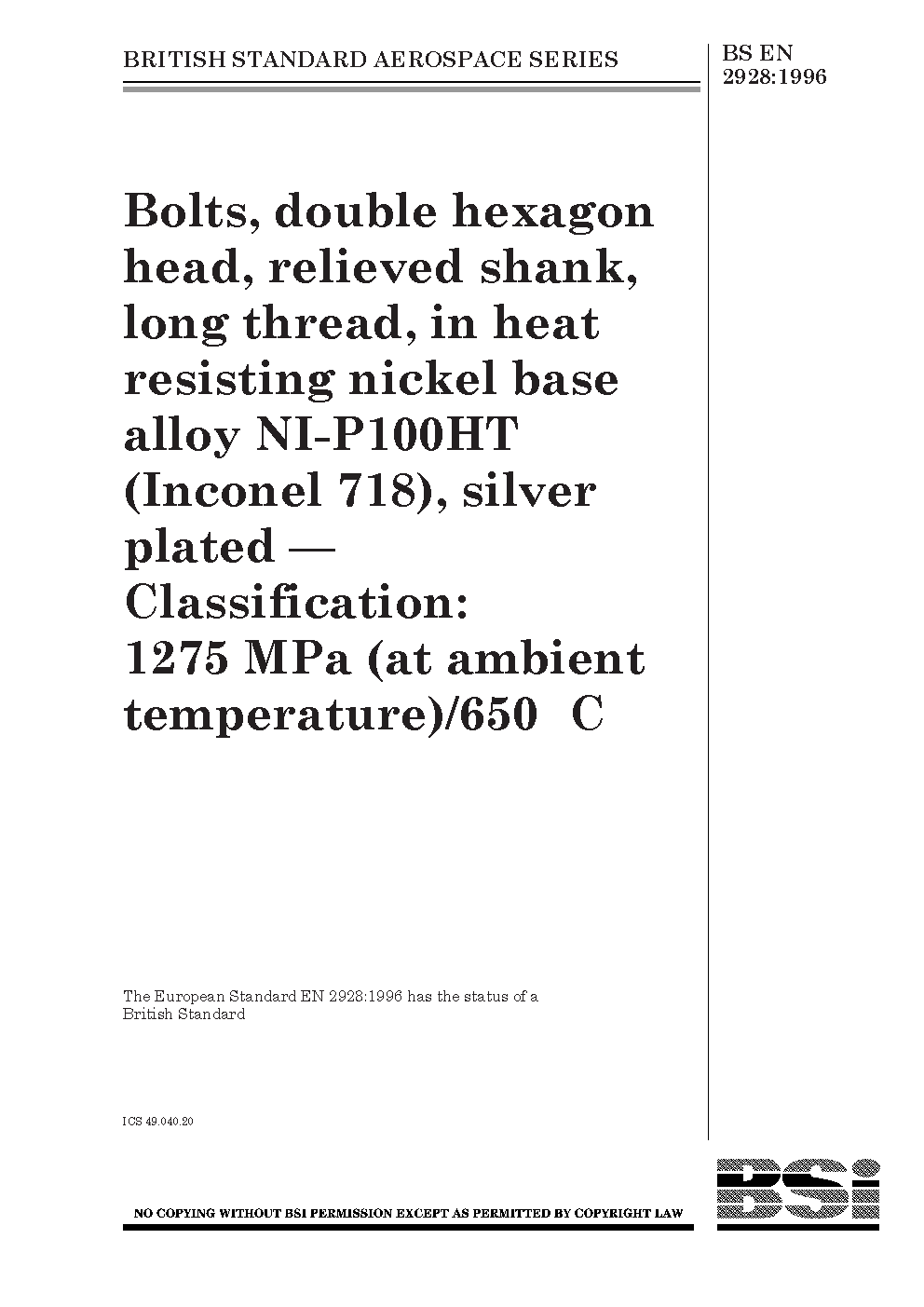 Bolts, double hexagon head, relieved shank, long thread, in heat resisting nickel base alloy NI-P100HT (Inconel 718), silver plated. Classification: 1275 MPa (at ambient temperature)/650°C