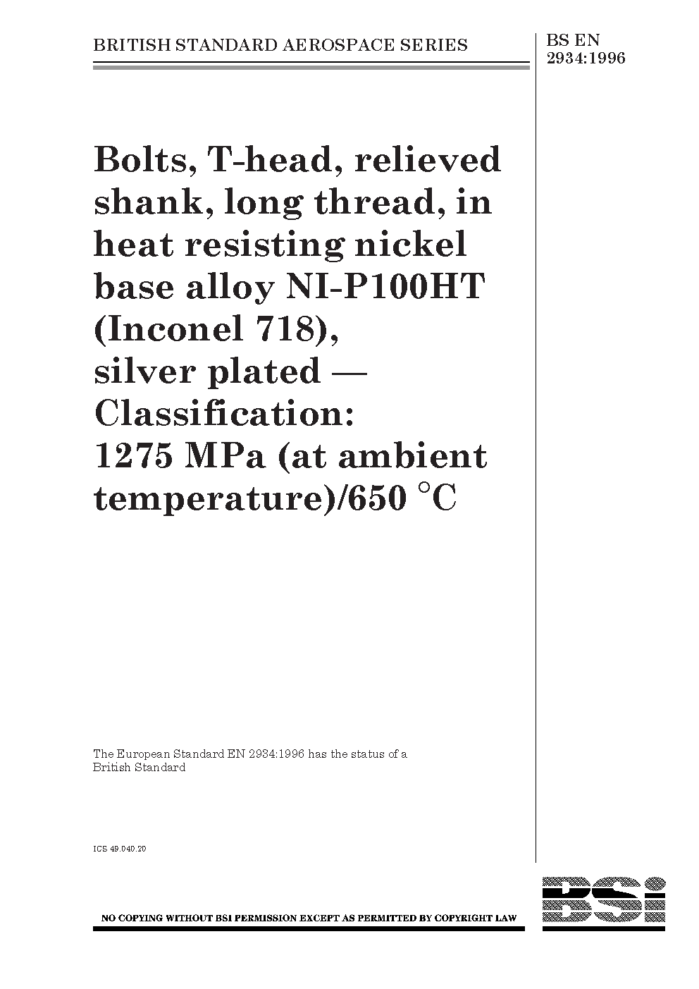 Bolts, T-head, relieved shank, long thread, in heat resisting nickel base alloy NI-P100HT (Inconel 718), silver plated. Classification:1275 MPa (at ambient temperature)/650°C