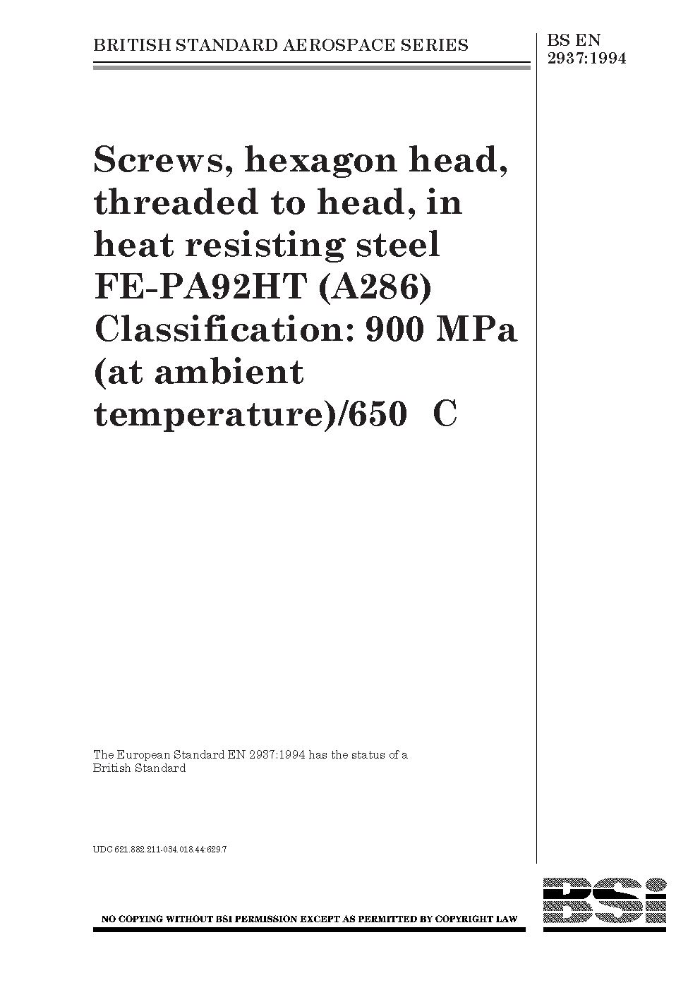 Aircraft components;Marking;Threaded fasteners;Steels;Dimensions;Hexagonal-head fasteners;Heat-resistant materials;Designations;External-thread fasteners;Threads;Codes;Mass;Fasteners;Screws (bolts)