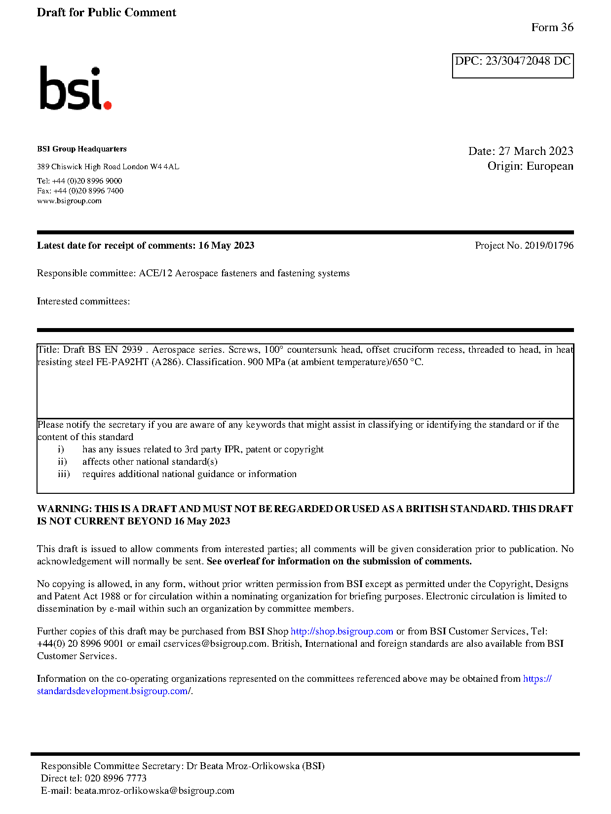 Screws, 100° countersunk head, offset cruciform recess, threaded to head in heat resisting steel FE-PA92HT (A286). Classification: 900 MPa (at ambient temperature)/650°C