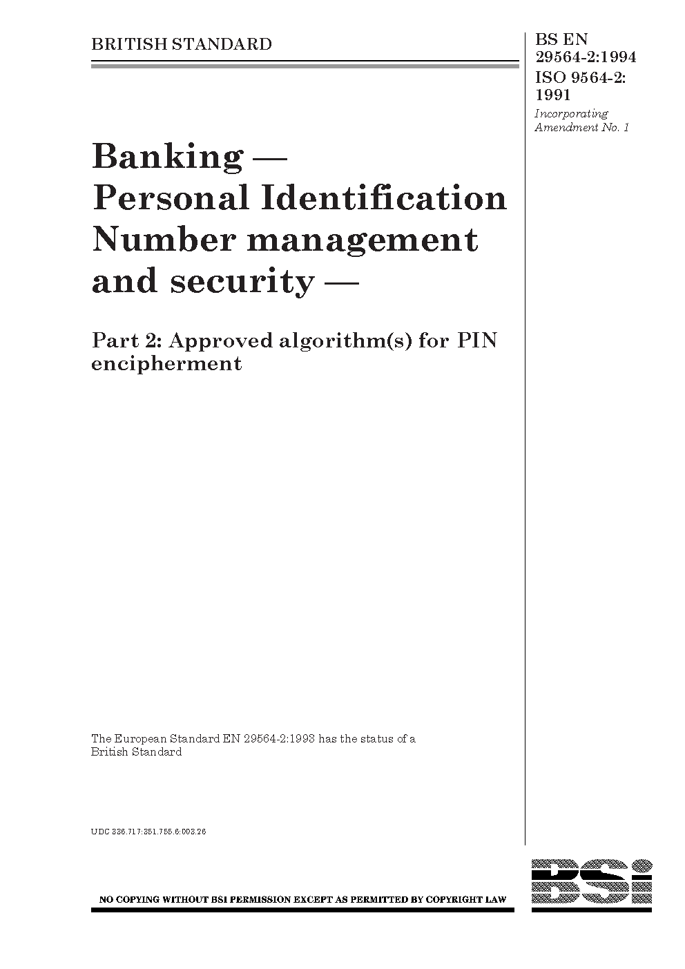Banking. Personal identification number management and security Approved algorithm(s) for PIN encipherment