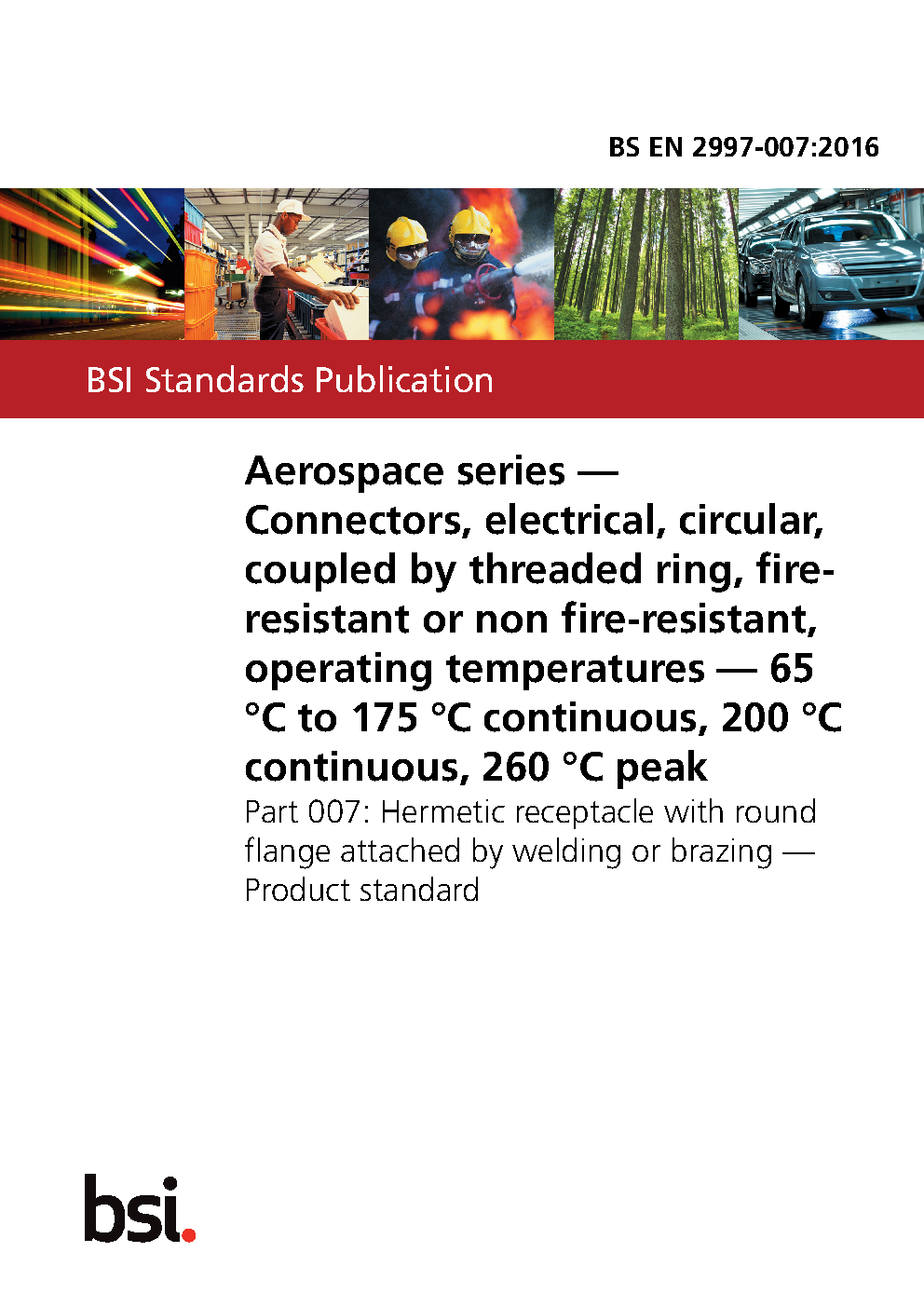 Aerospace series. Connectors, electrical, circular, coupled by threaded ring, fire-resistant or non fire-resistant, operating temperatures -65°C to 175°C continuous, 200°C 260°C peak Hermetic receptacle with round flange attached welding brazing. Product standard