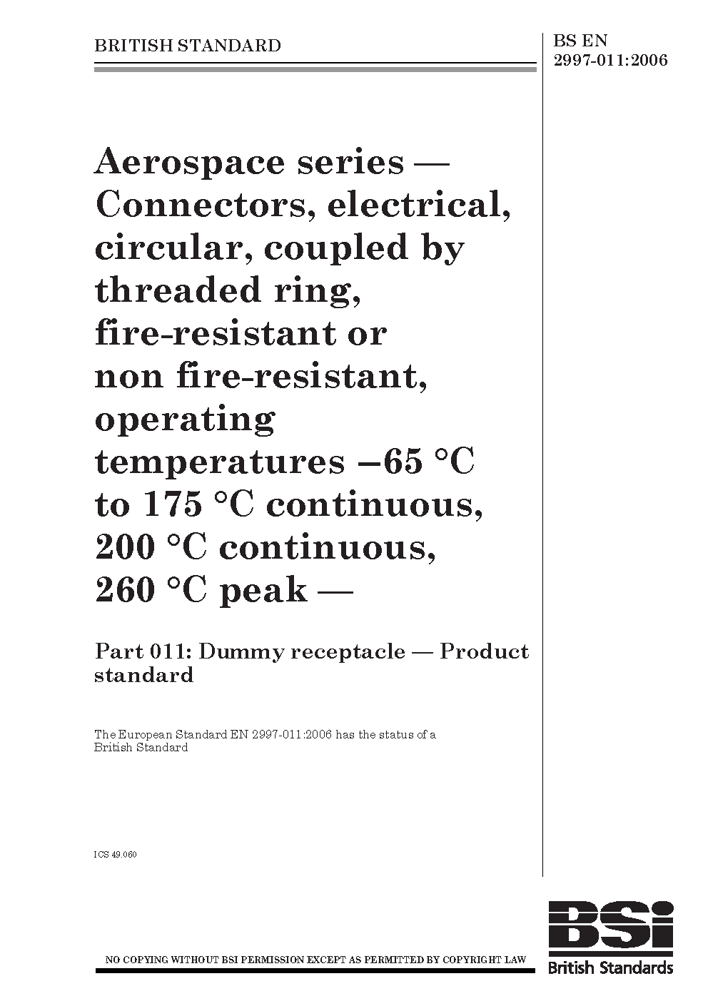 Aerospace series. Connectors, electrical, circular, coupled by threaded ring, fire-resistant or non fire-resistant, operating temperatures -65°C to 175°C continuous, 200°C 260°C peak Dummy receptacle. Product standard
