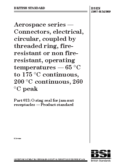 Aerospace series. Connectors, electrical, circular, coupled by threaded ring, fire-resistant or non fire- resistant, operating temperatures -65 °C to 175 continuous, 200 260 peak O-ring seal for jam-nut receptacles. Product standard