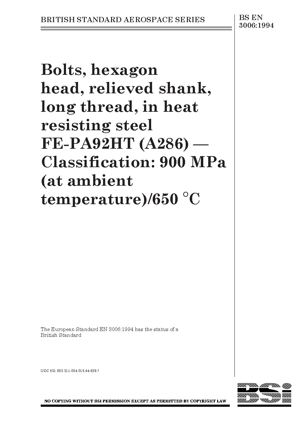 Fasteners;Heat-resistant materials;Threads;Bolts;Temperature;Steels;Aircraft components;Length;Marking;External-thread fasteners;Threaded fasteners;Dimensional tolerances;Designations;Shape;Preferred sizes;Heads (fasteners);Dimensions;Hexagonal-head fasteners;Mass