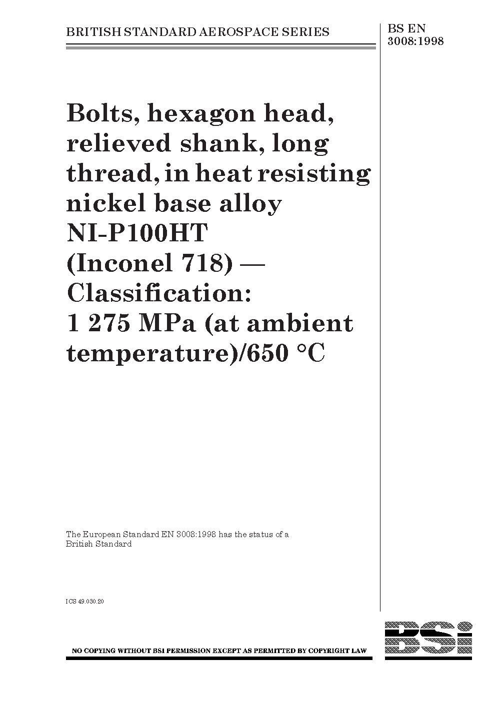 Bolts, hexagon head, relieved shank, long thread, in heat resisting nickel base alloy NI-P100HT (Inconel 718). Classification:1275 MPa (at ambient temperature)/650°C