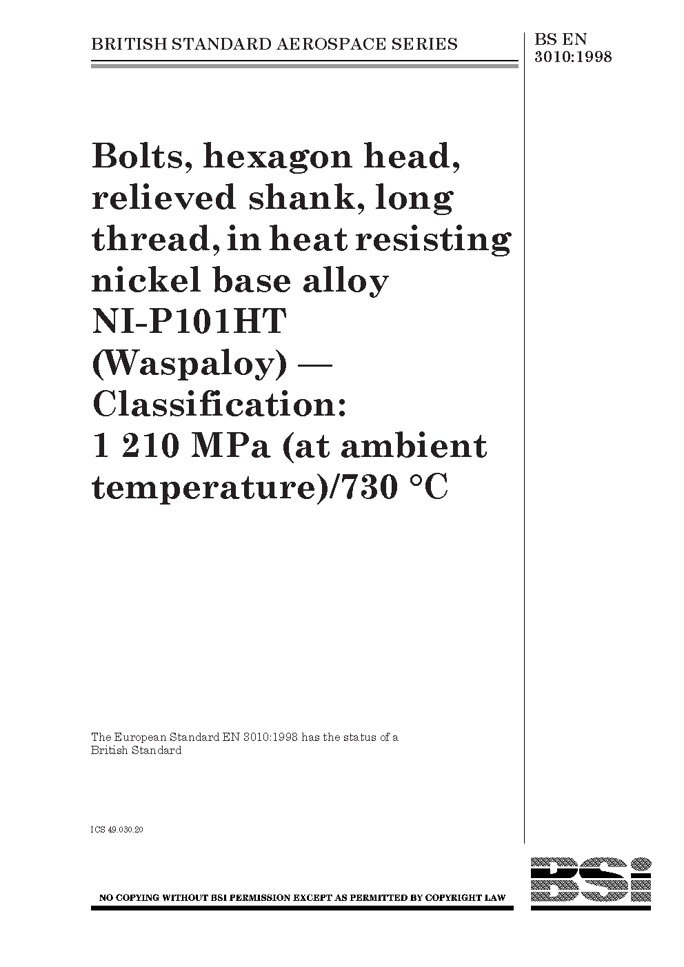 Temperature;Heat-resistant materials;Tensile strength;Hexagonal-head fasteners;Threaded fasteners;Designations;Aircraft components;External-thread fasteners;Fasteners;Bolts;Marking;Threads;Nickel alloys;Mass;Dimensions