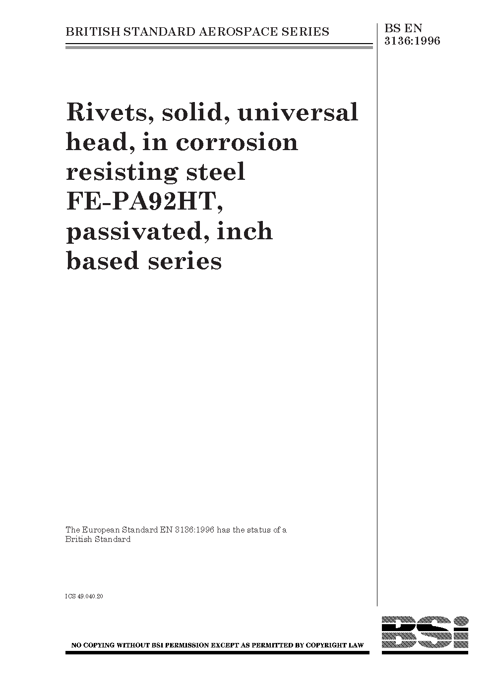 Aircraft components;Dimensional tolerances;Fasteners;Imperial system;Dimensions;Mass;Corrosion-resistant steels;Passivation;Threadless fasteners;Solid (shape);Designations;Preferred sizes;Rivets