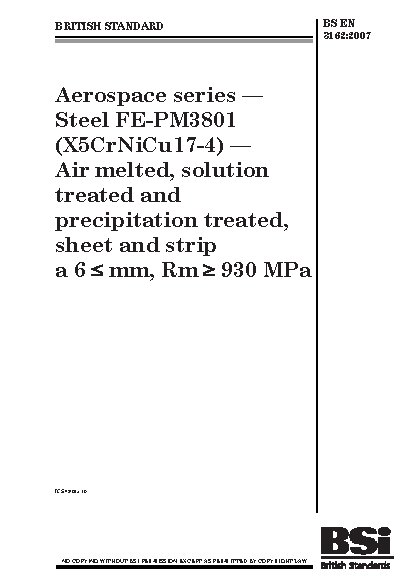 Tensile strength;Dimensions;Chemical composition;Strips;Air;Sheet materials;Solution heat treatment;Hardness;Elongation;Bending;Precipitation hardening;Steels;Proof stress;Grain size;Heat treatment;Crystal microstructure;Air transport engineering;Melting