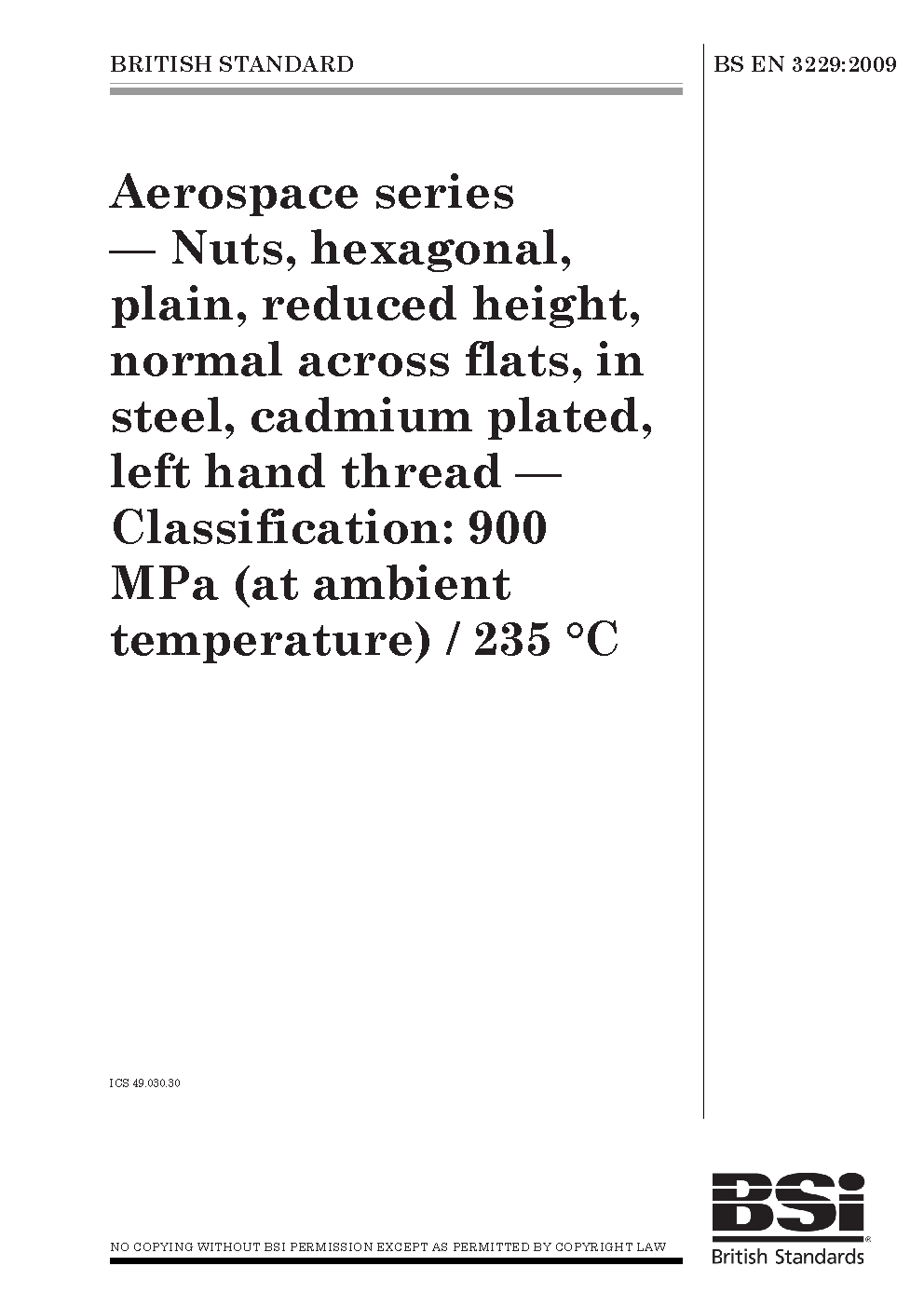 Aerospace series. Nuts, hexagonal, plain, reduced height, normal across flats, in steel, cadmium plated, left hand thread. Classification: 900 MPa (at ambient temperature)/235°C