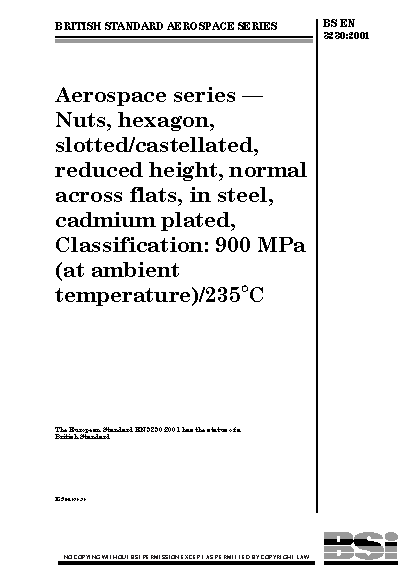 Aerospace series. Nuts, hexagon, slotted/castellated, reduced height, normal across flats, in steel, cadmium plated. Classificaiton: 900 MPa (at ambient temperature)/235°C